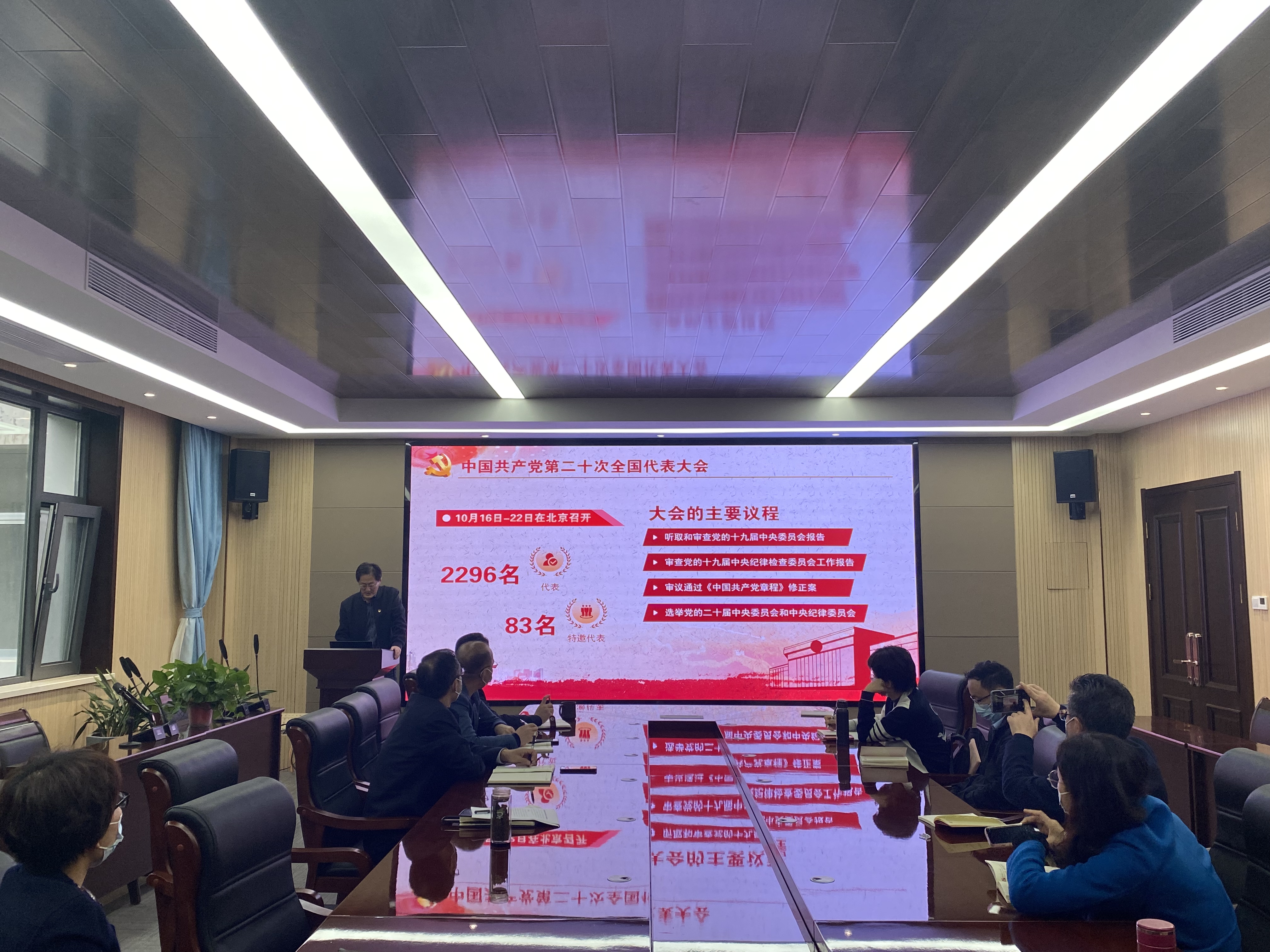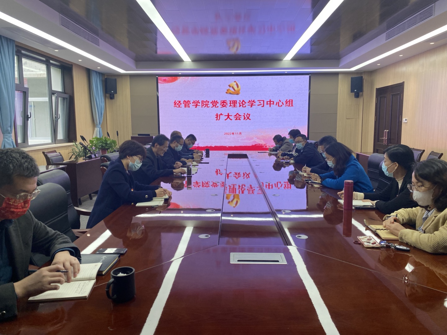 在313会议室召开党委理论学习中心组扩大会议暨党支部书记专题培训会,专题学习党的二十大精神。学院党委书记李德成,院长李勋来及学院领导班子成员,各支部书记参加会议。会议由李德成主持。