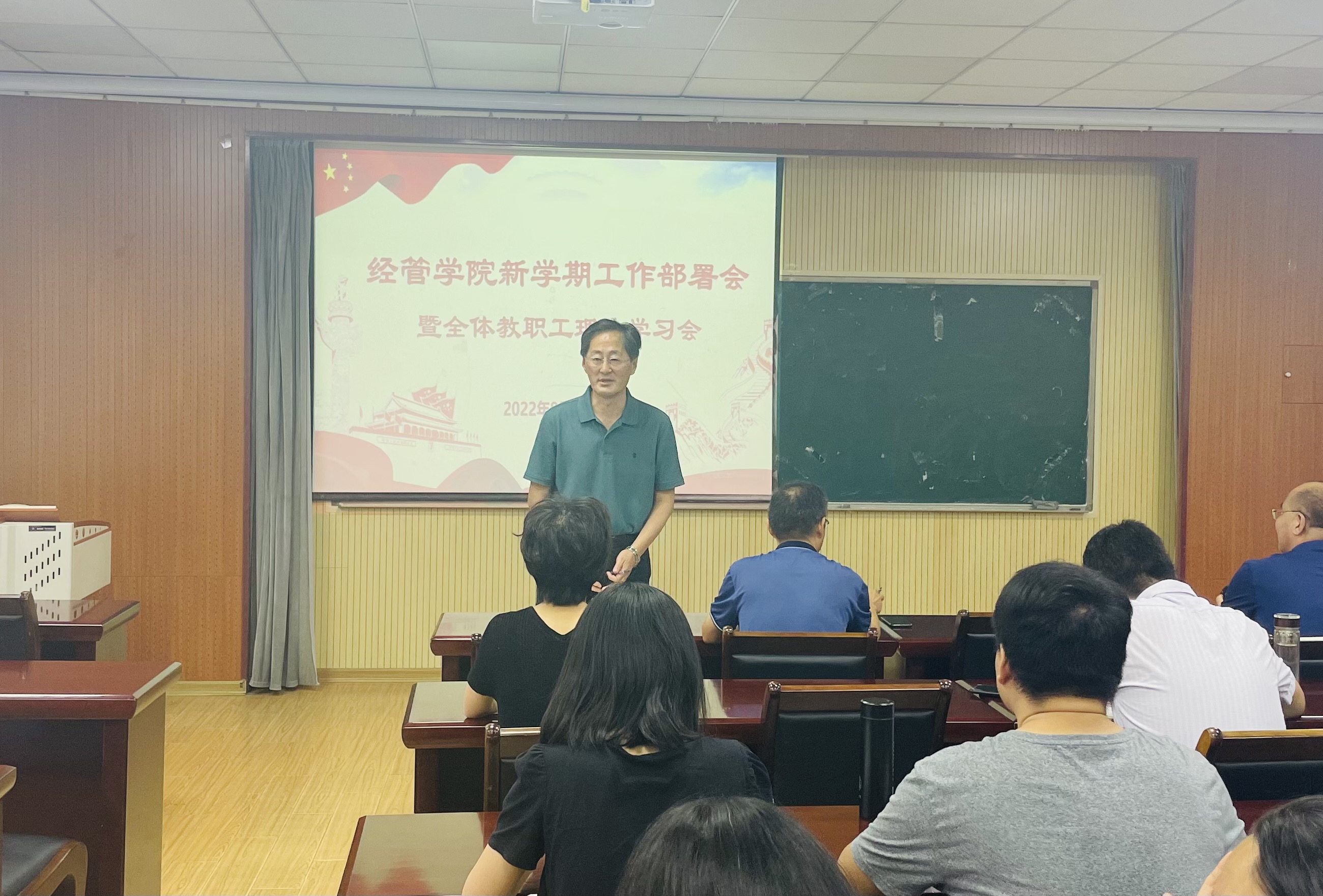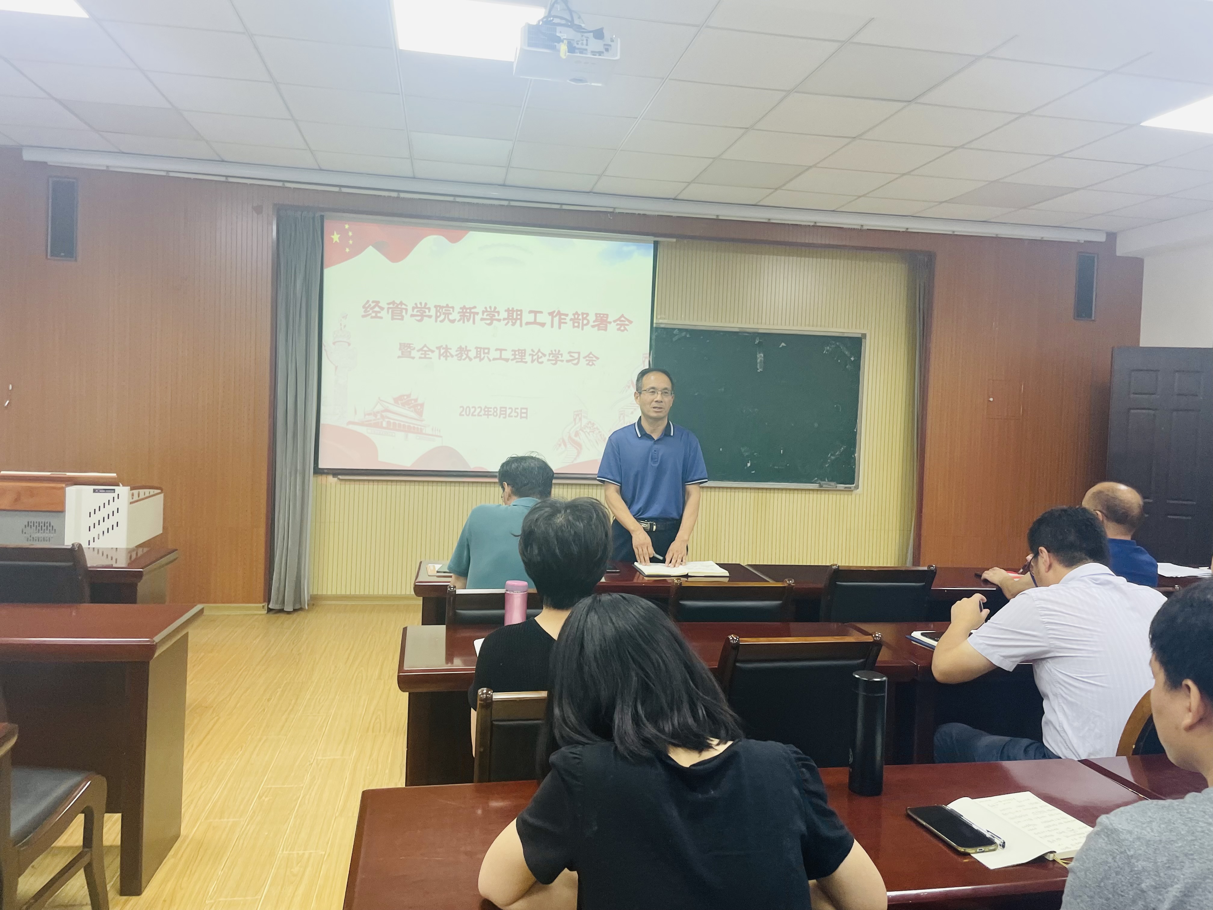 于经管楼419会议室组织召开新学期工作部署会暨全体教职工理论学习会。学院全体教职工参与会议,党委书记李德成主持会议。