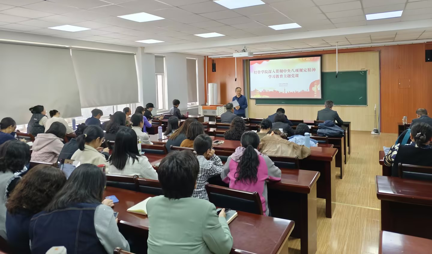 党委书记李勋来讲授深入贯彻中央八项规定精神学习教育主题党课,学院全体党员、干部及教职工参加学习。