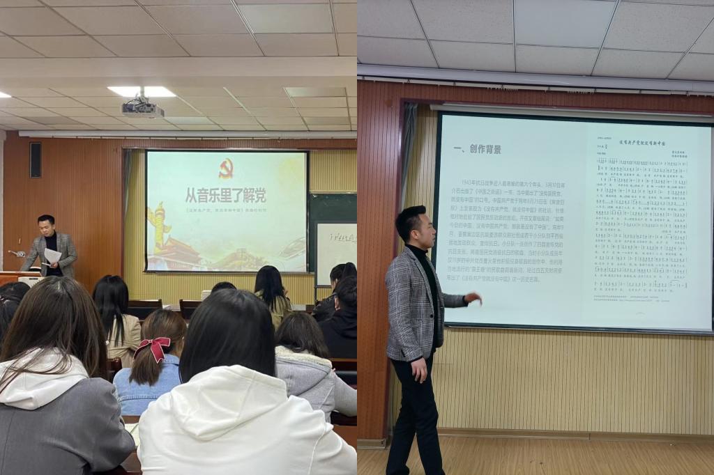 “音乐党课“忆激情岁月:高守朋老师以一首《没有共产党就没有新中国》带领全体党员翻开风云激荡的红色篇章。通过讲述歌曲的创作背景,让同学们回到抗战年代,重温峥嵘岁月;借以歌曲创作者曹火星的经历,让大家体会到青年才子愿做星火、誓在革命队伍中发光发热的决心;带领全体党员齐声高唱《没有共产党就没有新中国》,表达浓浓的爱党爱国之情。