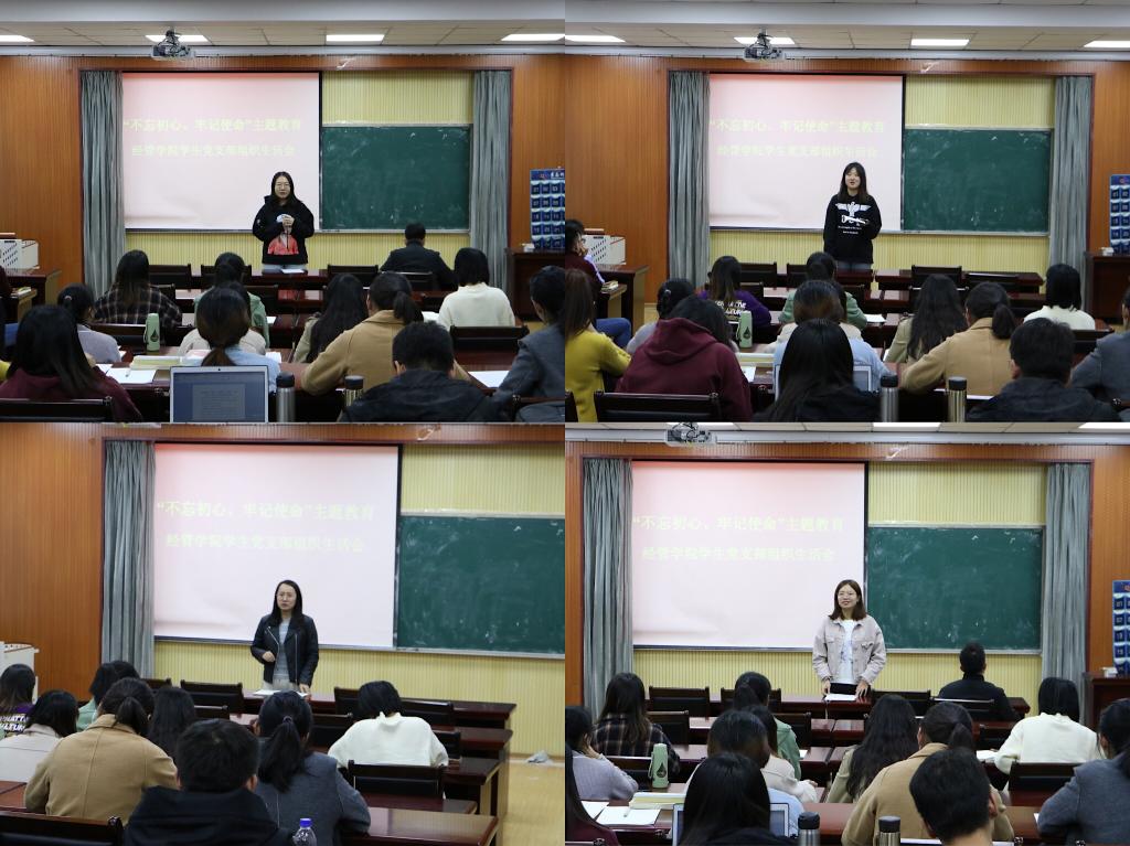 接下来,为进一步夯实学习效果,促进成果转化,财务161班本科生党员王安琪、金融学17级研究生党员王希、企业管理18级研究生于雪琴、会计19级研究生党员田真四位党员代表结合自身经历,依次从对“初心”和“使命”的理解、学术研究、基层党员服务和未来展望等方面为同学们带来了一次别开生面的分享,全场气氛热烈,互动频频。国贸161班党员代表王清玥表示:“前辈们的讲话深入浅出,使我真正地认识到一名优秀的学生党员应该是什么样的,进一步增强了我深化思想认识,深刻检视问题,深入整改落实的动力。今后我一定会推动思想政治学习往深里走、往心里走、往实里走,取得新进步、达到新高度。”