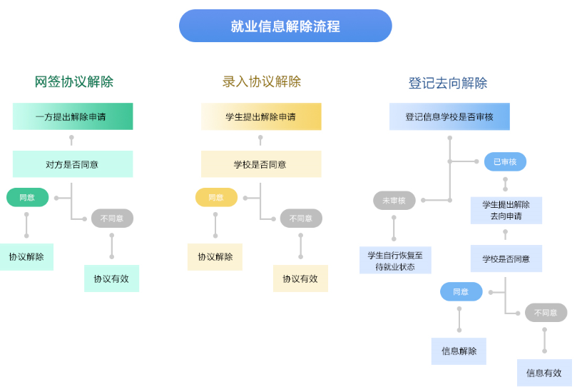 毕业生登记(劳动合同、灵活就业、升学、出国(境)、自主创业、应征入伍、基层项目)等去向信息保存并提交院校审核。根据院校是否已完成审核,区分两种解除方式。