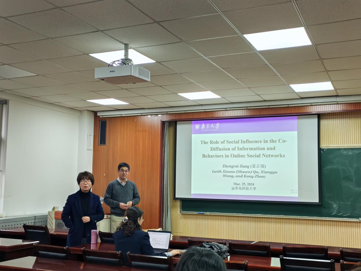 讲座中,姜正瑞教授结合文本挖掘、社会网络分析和生存分析,为大家介绍了与Twitter上“冰桶挑战”活动相关的信息和行为的同步传播研究。本研究旨在了解信息的传播和行为是否相似,以及社会影响是否在这些过程中发挥同样重要的作用。他为大家展示了这两个过程遵循不同的模式,单方面的社会影响有助于信息的传播,而不是行为的传播,通过交流过程传达的双边影响是行为和信息传播的重要和积极的预测因子。