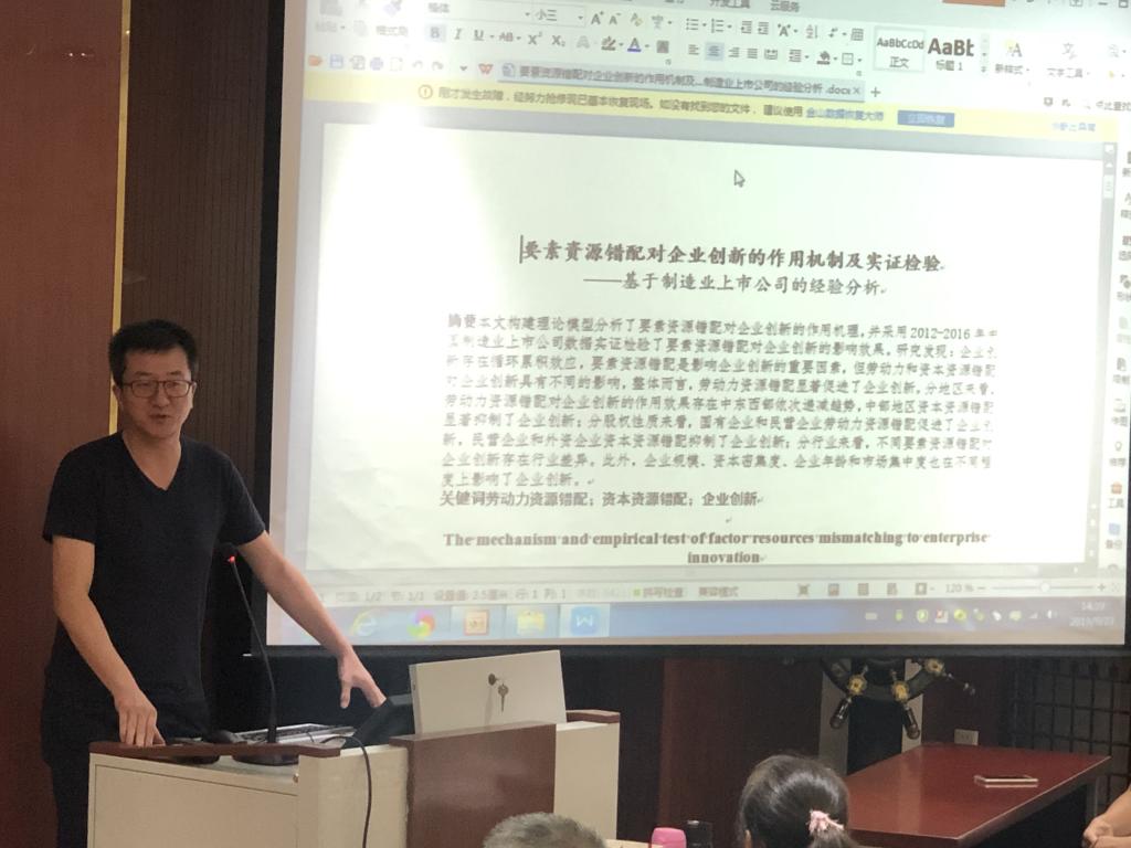欢迎仪式结束后,吕承超教授向在座师生汇报了题为《要素资源错配对企业创新的作用机制及实证检验——基于制造业上市公司的经验分析》的论文。该论文构建理论模型分析了要素资源错配对企业创新的作用机理,并采用2012-2016年中国制造业上市公司数据实证检验了要素资源错配对企业创新的影响效果。该研究发现企业创新存在循环累积效应,要素资源错配是影响企业创新的重要因素,但劳动力和资本资源错配对企业创新具有不同的影响,劳动力资源错配显著促进了企业创新。随后,刘霞辉教授、黄少安教授对论文做了精彩的点评,并提出了合理的修改建议。