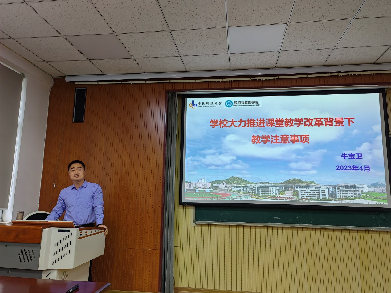 为提升学院全体教师教学能力,深化课堂教学质量改革,更好的理解学校课堂教学改革相关政策,4月3日下午,我院在经管楼419举行教师培训报告会。学院党委副书记兼副院长牛宝卫做题为《课堂教学改革背景下教学注意事项》的报告。