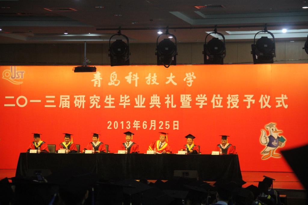 2013届研究生毕业典礼暨学位授予仪式在崂山校区第二报告厅隆重举行。校领导高青、马连湘、罗公利、李庆领、刘光烨、韦殿华出席典礼并在主席台就座,大会由研究生工作处处长王永岩主持。