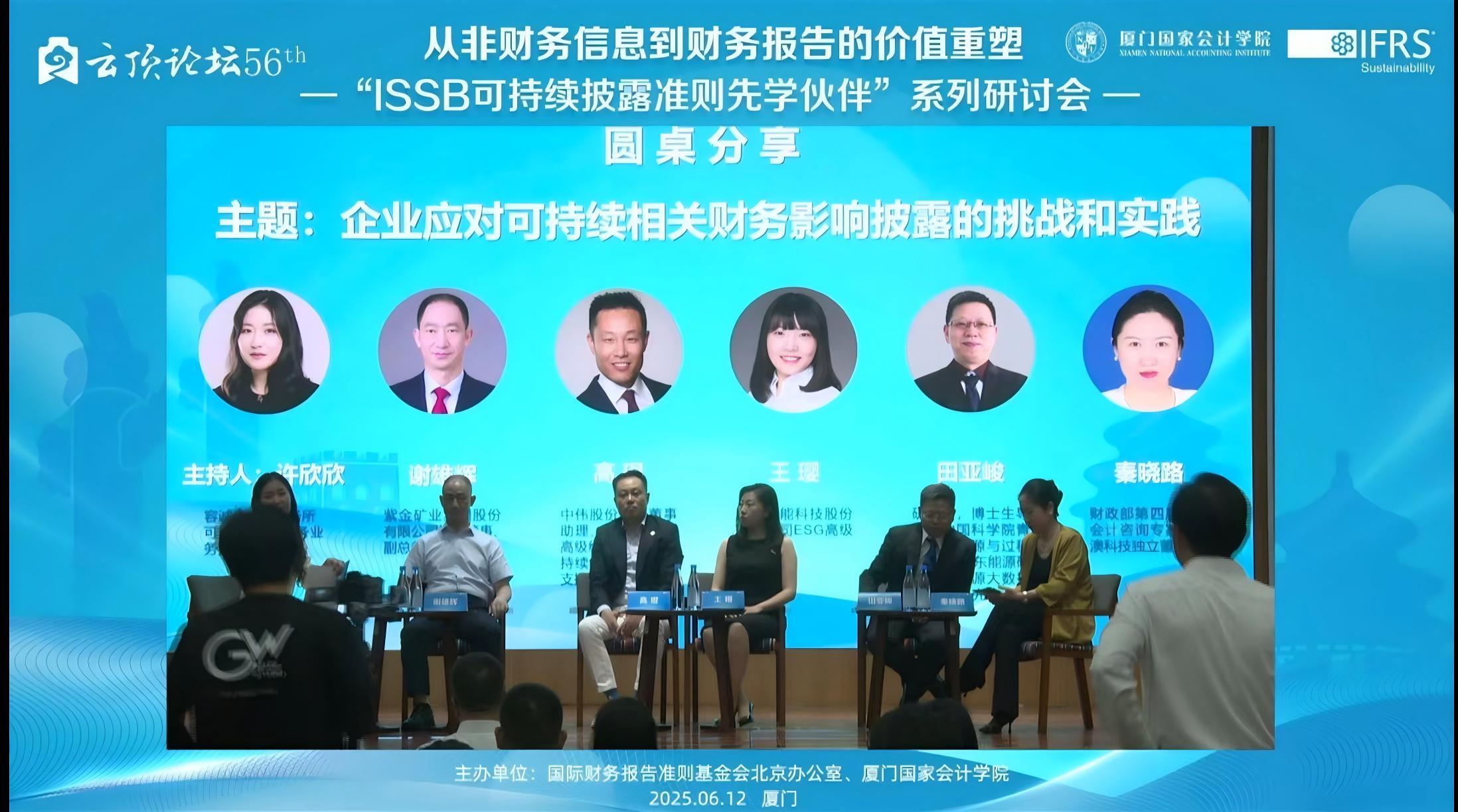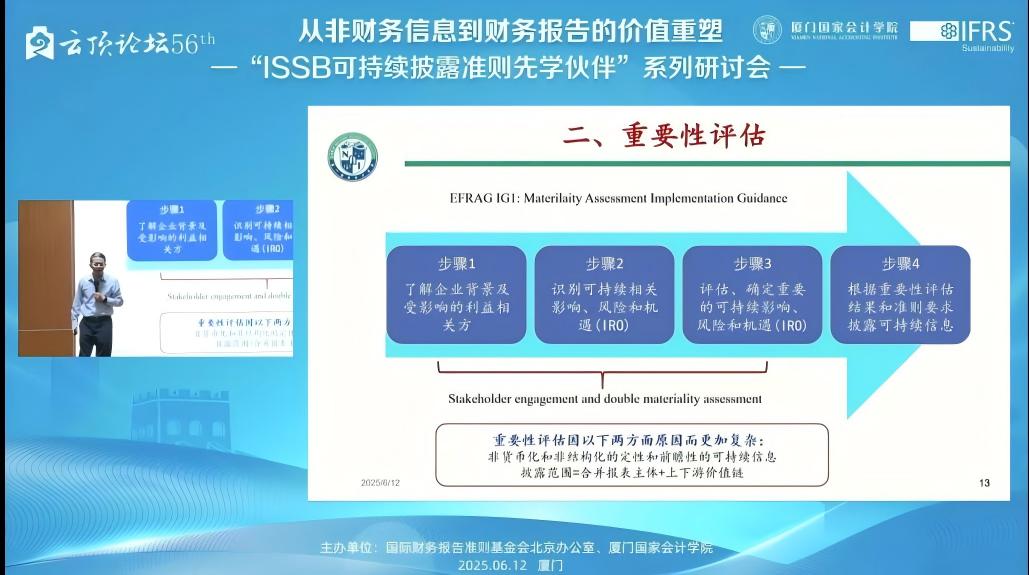 2025年6月12日,下午14:00——17:15,由国际财务报告准则基金会北京办公室与厦门国家会计学院主办的,第56届云顶论坛:从非财务信息到财务报告的价值重塑——“ISSB可持续披露准则先学伙伴”厦门研讨会在厦门国家会计学院学术报告厅B区顺利举办。同时,我校MPAcc学生也通过厦门国家会计学院微信公众号的直播同步参与了该学术讲座。